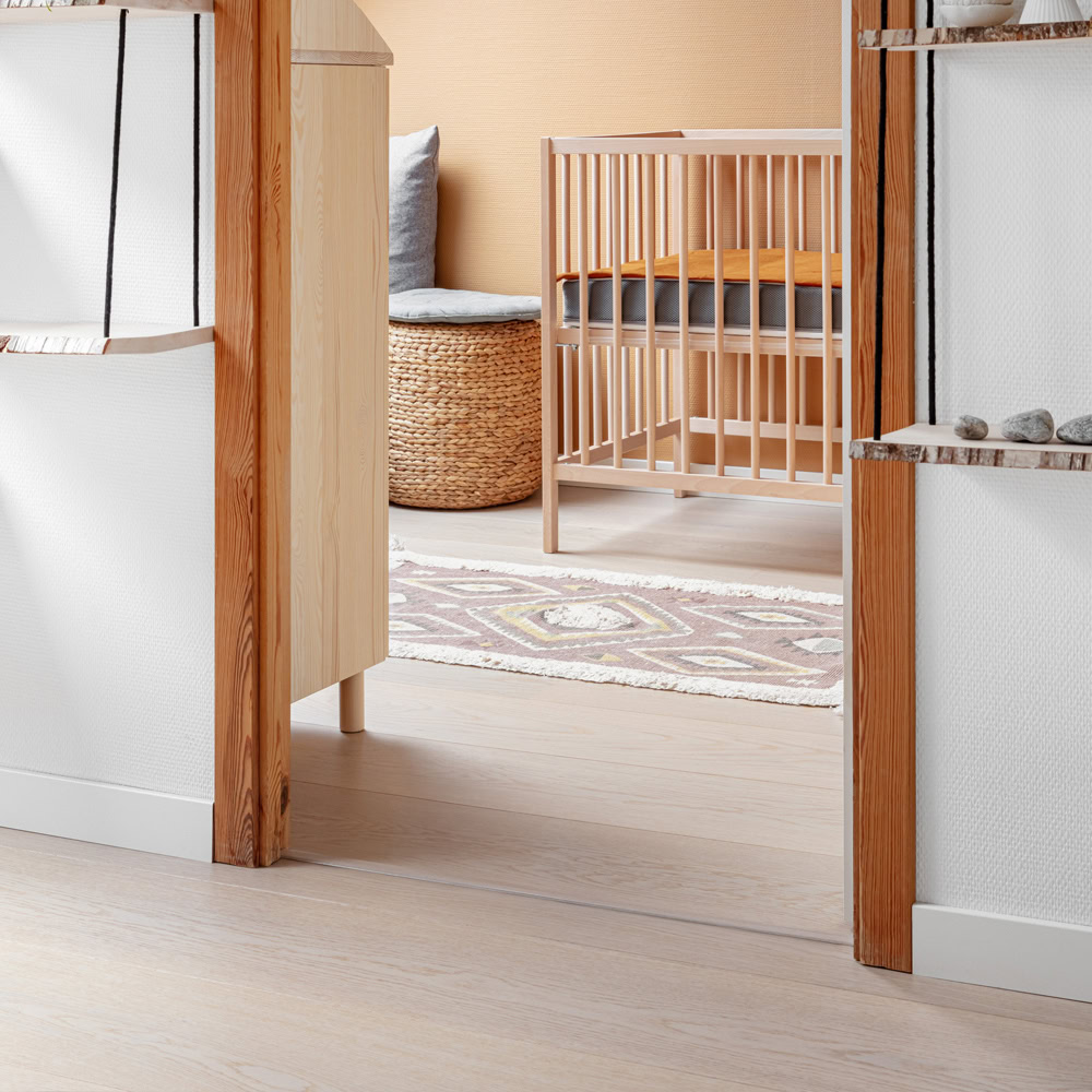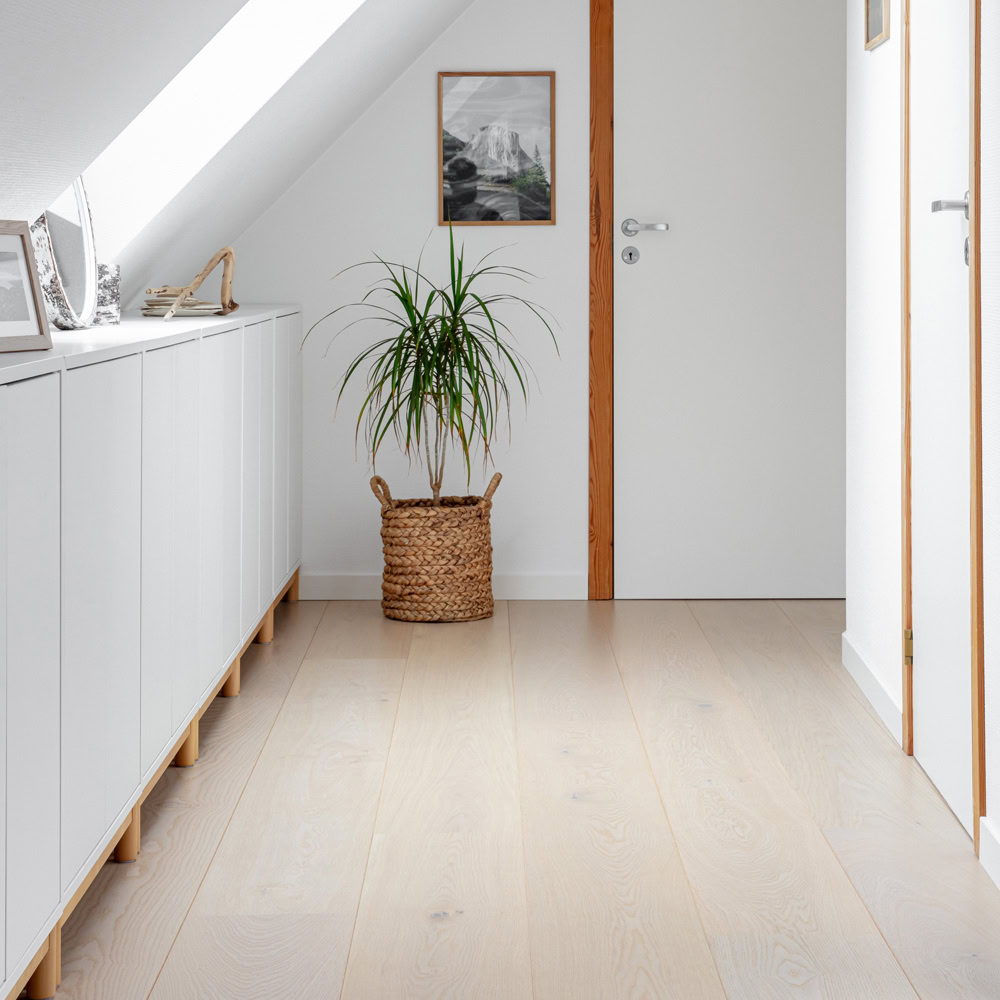 Den hvitmattlakkede overflaten gir god beskyttelse mot flekker og krever ingen vedlikehold. Parketten har 7 lag med UV-lakk.