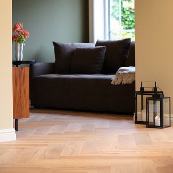Parkettstavene måler 130 mm i bredde og legges i 90 graders vinkel for å danne det karakteristiske fiskebensmønsteret – et mønster som gir dybde, liv og eleganse til rommet.