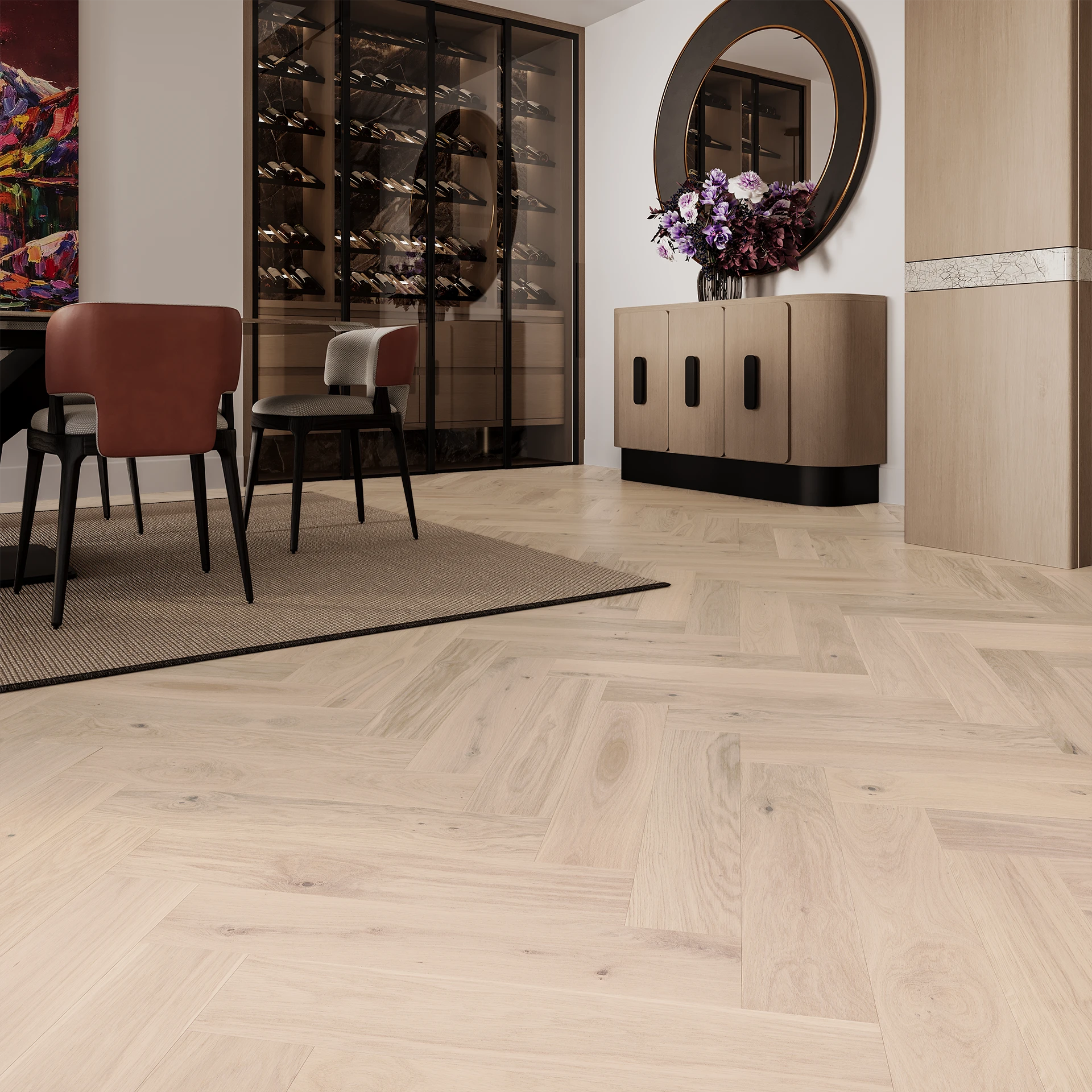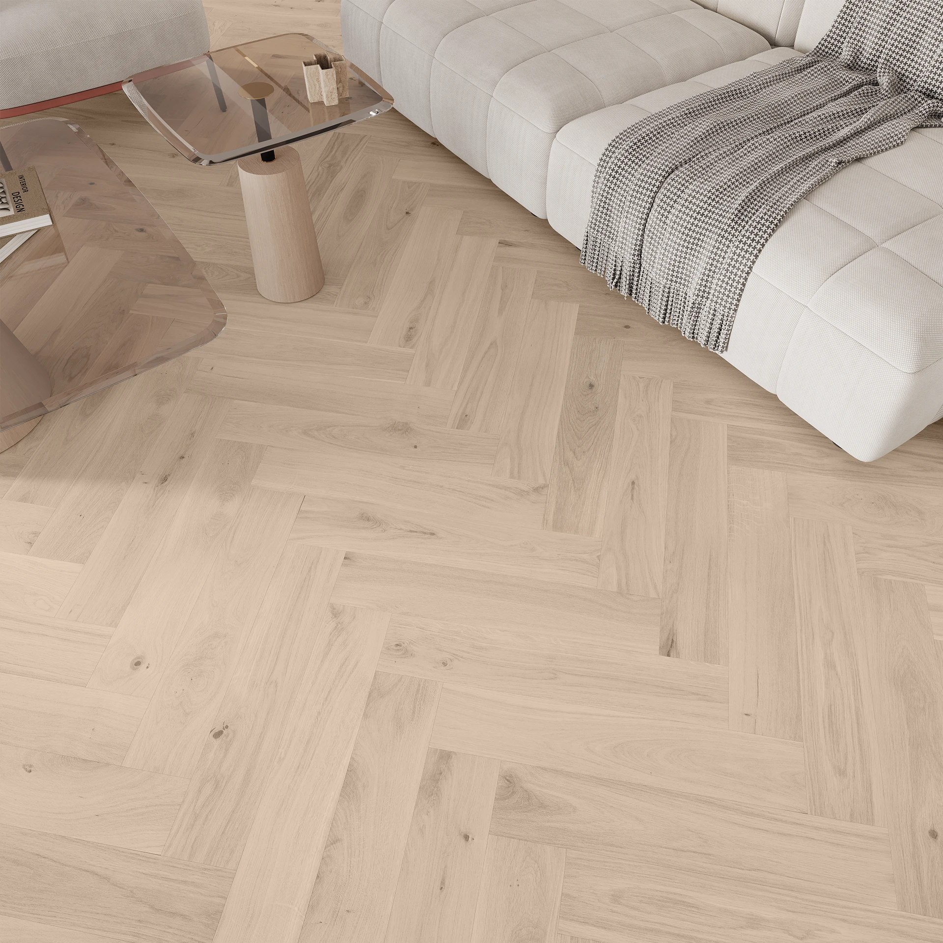 Det karakteristiske fiskebensmønsteret gir liv og dynamikk til rommet. Stavene monteres i 90 graders vinkel, noe som skaper det ikoniske mønsteret som aldri går av moten.
